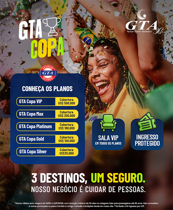O seguro é dividido em cinco categorias que contemplam diferentes perfis de viajantes, desde os mais econômicos aos exigentes, garantindo tranquilidade aos passageiros em situações de urgências e emergências médicas, despesas farmacêuticas e odontológicas, problemas com bagagem, fianças, despesas judicias, entre outros serviços: Plano Copa GTA Silver: US$ 35 mil em coberturas; Plano Copa GTA Gold: US$ 100 mil em coberturas; Plano Copa GTA Platinum: US$ 180 mil em coberturas; Plano Copa GTA Max: US$ 300 mil em coberturas; Plano Copa GTA VIP: US$ 500 mil em coberturas. Outro diferencial é o acesso às salas VIP W Premium, incluído em todas as categorias do plano, Os planos já estão disponíveis para aquisição no site www.segurogta.com.br e são válidos para passageiros de até 85 anos, em viagens realizadas de 3 de junho a 22 de julho de 2026, na categoria lazer.
